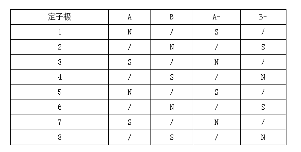 Two sets of coils, called A phase and B phase, will be wound around the 8 pole claws. Refer to Figure 2 for the winding method. Among them, poles 1, 3, 5, and 7 are one phase (phase A), corresponding to one line, while poles 2, 4, 6, and 8 are another phase (phase B), corresponding to another line, leading out a total of four wire ends. Figure 3 shows the winding direction of each winding, with arrows representing the winding direction of the wire harness outside the paper plane.