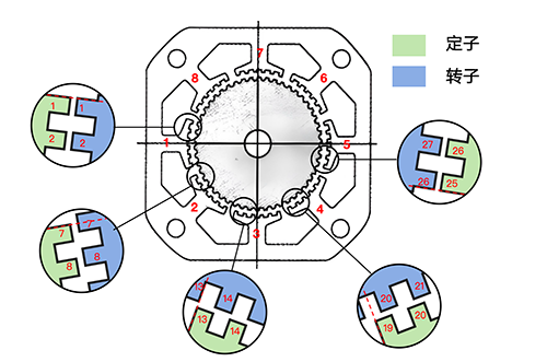 Due to the existence of the pole gap, the second pole stator teeth "lead" the rotor teeth by 1/4 of a tooth, which is called "semi alignment". (Refer to the position relationship of the 7th tooth of the stator/rotor) The same third pole "leading" rotor has an additional 1/4 tooth, which is 1/2 tooth, completely offset. You can refer to the position relationship of the 13th fixed/rotor tooth. The teeth of the fourth pole are "leading" by 3/4 of the rotor teeth, semi aligned; The fifth pole "leads" by a complete tooth, so the stator and rotor teeth are perfectly aligned again.