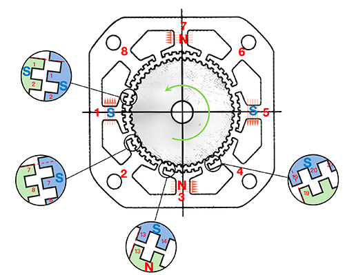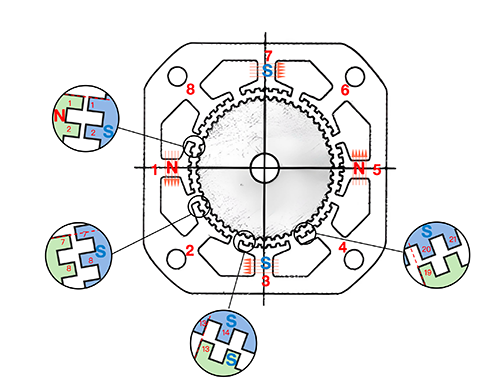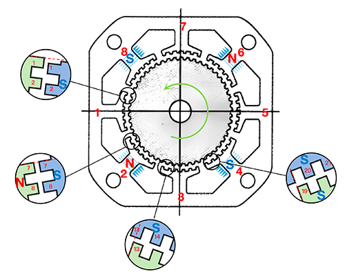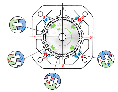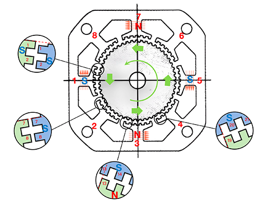 The following steps 6, 7, and 8 repeat the above process, and finally return to the first pole. Throughout the entire process, the stator and rotor are two teeth apart.