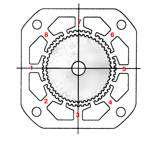 Mark the 8 poles of the stator counterclockwise as 1-8 # in sequence. Mark the first tooth of the first pole as stator tooth 1 and mark it counterclockwise in sequence. The rotor teeth corresponding to stator tooth 1 are labeled as rotor tooth 1, and are marked counterclockwise in sequence. Align the first pole with the rotor teeth exactly, as shown in Figure 2.