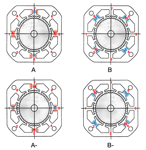 The fourth step B is to apply a reverse current (B -), which still generates a counterclockwise torque on the rotor. If this continues, the rotor will gradually rotate step by step.