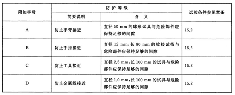 Additional letters (optional) represent the protection level for approaching hazardous components, divided into four levels: ABCD (Figure 3). At first glance, it may seem to conflict with the first feature number, but in fact, the two are complementary to each other. The first characteristic number focuses on the shell's ability to prevent hands, tools, etc. from entering (anti entry), while the additional letters focus on preventing contact with dangerous components (anti touch). For example, IPXXB indicates that the device does not specify the level of foreign object and water resistance, but can protect fingers from touching dangerous parts.