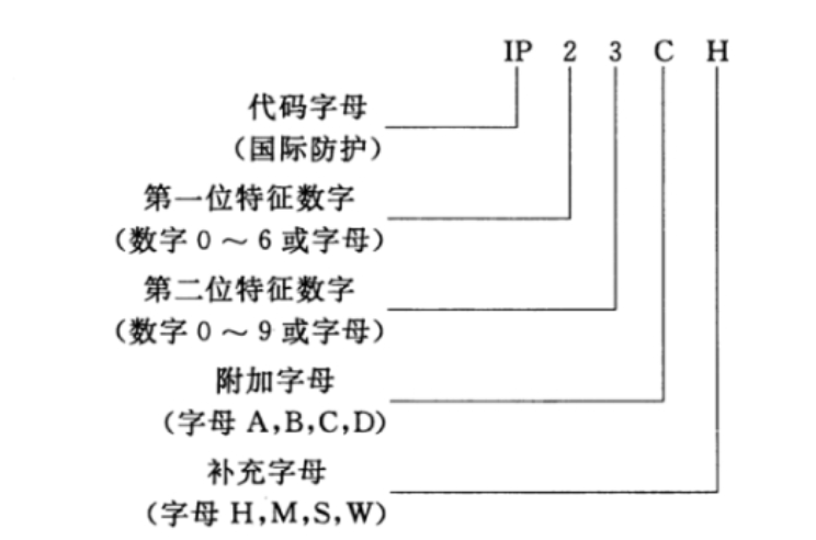 As shown in Figure 1, the IP code starts with the letter IP, representing International Protection/Ingress Protection. There are two interpretations, and the national standard uses the meaning of "International Protection". The IP letter is followed by two characteristic numbers to indicate the level of protection. Following the numbers are additional letters and supplementary letters, representing the protection level and testing conditions for hazardous components, respectively.