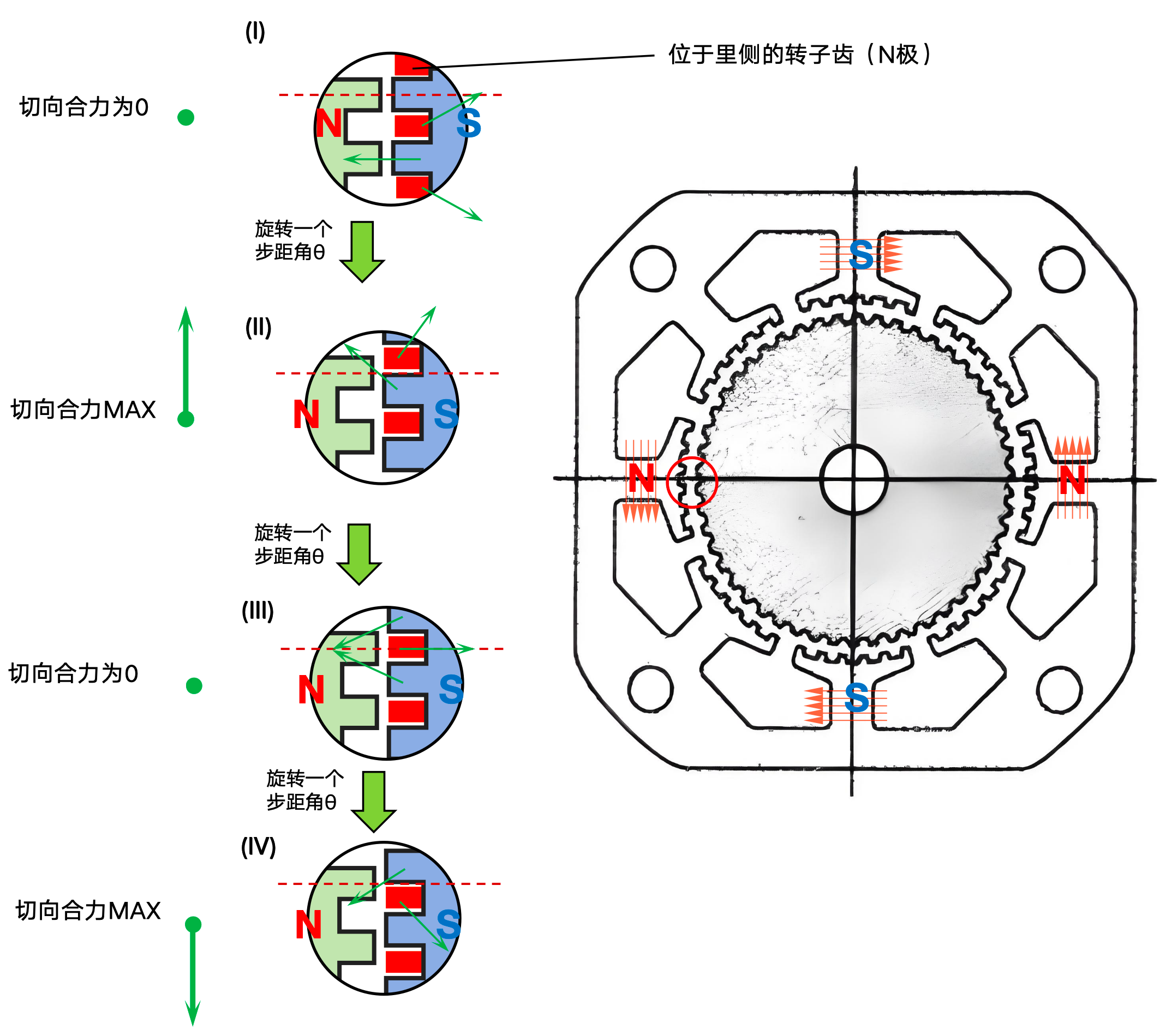 As shown in Figure 1, when one phase of the stepper motor is energized, the left and right stator poles are N-poles, and the upper and lower poles are S-poles. The outer side of the rotor is S-pole, and the inner side is N-pole. Taking the leftmost stator and rotor teeth for analysis, Position (I) is a stable equilibrium position where the N-pole teeth of the stator align with the S-pole (outer) teeth of the rotor and misalign with the N-pole (inner) teeth. Force analysis shows that the electromagnetic forces exerted on the rotor by each stator tooth are symmetric, canceling each other tangentially with a resultant force of zero.